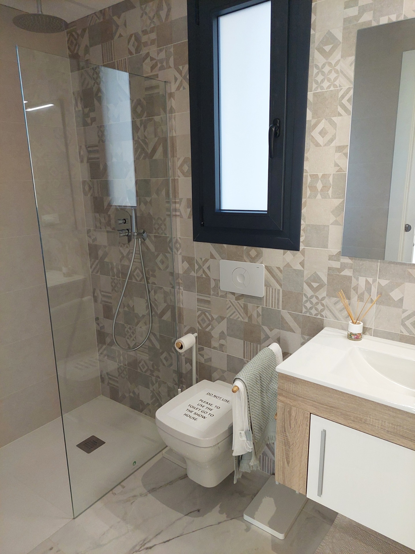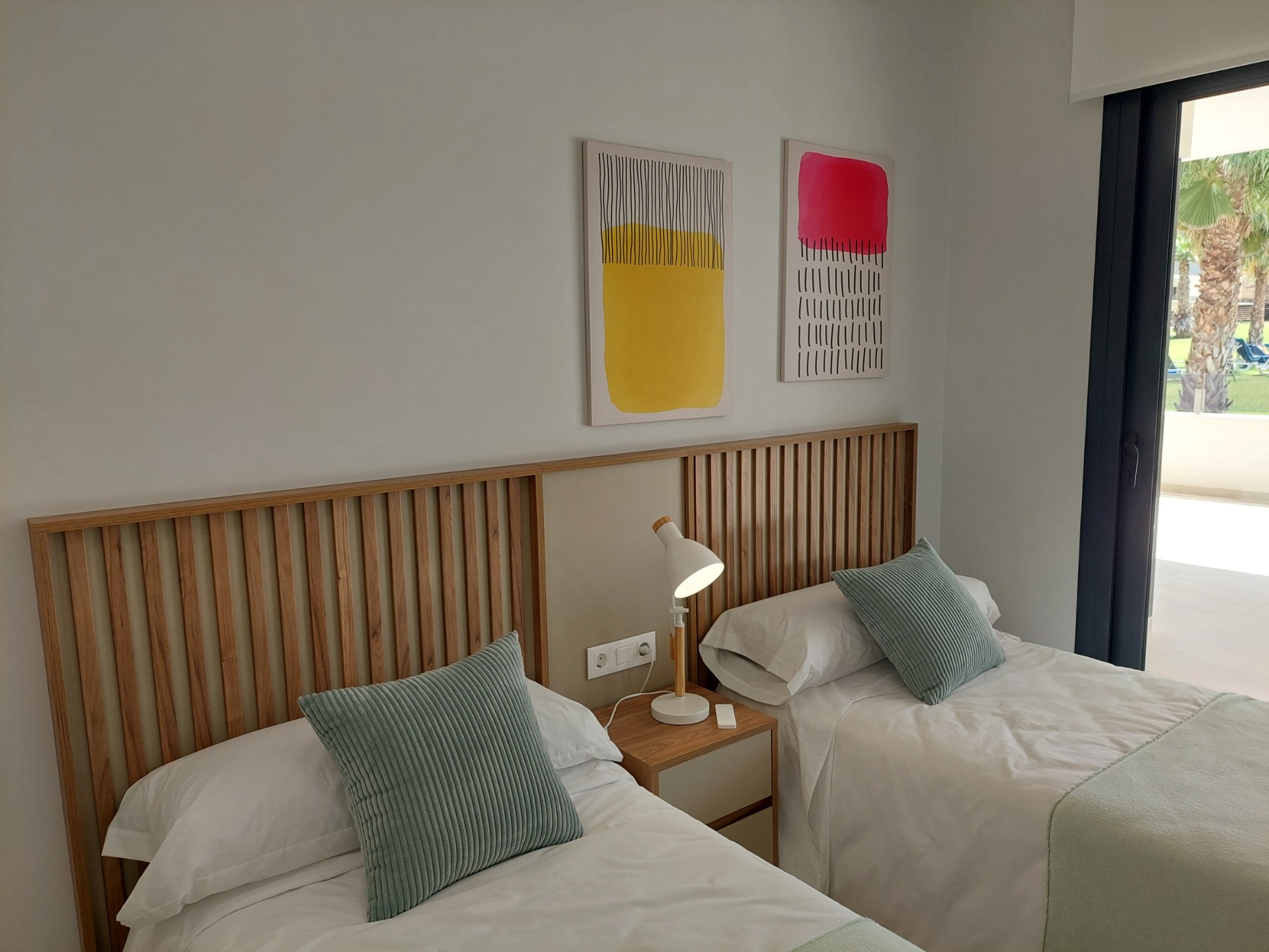 Deze lichte en comfortabele slaapkamer is uitgerust met twee eenpersoonsbedden (90x200) en een badkamer, ideaal voor gasten of familie. Het schuifraam biedt directe toegang tot het terras, zodat je kunt genieten van de frisse lucht en het mediterrane uitzicht.